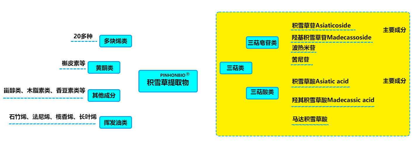 积雪草富含五环三萜类,多炔烯烃类,黄酮类,植物甾醇等活性成分,其药用功效主要得益于三萜类组分,积雪草苷、羟基积雪草苷、积雪草酸和羟基积雪草酸等。